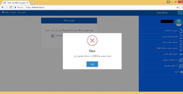 ابتدا با فروشنده تماس بگیرید. در صورت خرید از فروشنده معتبر و قانونی، میتوانید با پشتیبانی سامانه همتا یا گمرک تماس گرفته و مشکل را پیگیری کنید. این خطا معمولاً به دلیل واردات غیررسمی یا سرقت دستگاه رخ میدهد.