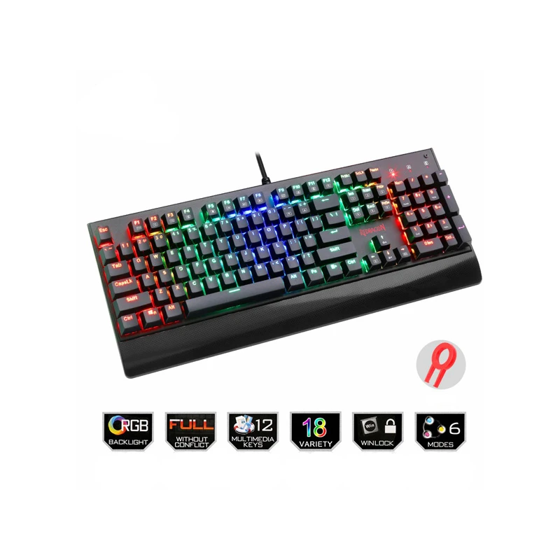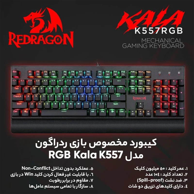 کیبورد گیمینگ ردراگون مدل Kala K557 RGB یک انتخاب حرفهای و مقرونبهصرفه برای گیمرها و کاربران حرفهای است که به دنبال تجربهای مکانیکی با نورپردازی RGB جذاب هستند. این کیبورد با طراحی Full Size و ساختار ترکیبی آلومینیومی-ABS، علاوه بر دوام بالا، فضای بیشتری روی میز کار یا بازی شما فراهم میآورد و به راحتی با محیطهای مختلف گیمینگ سازگار است.